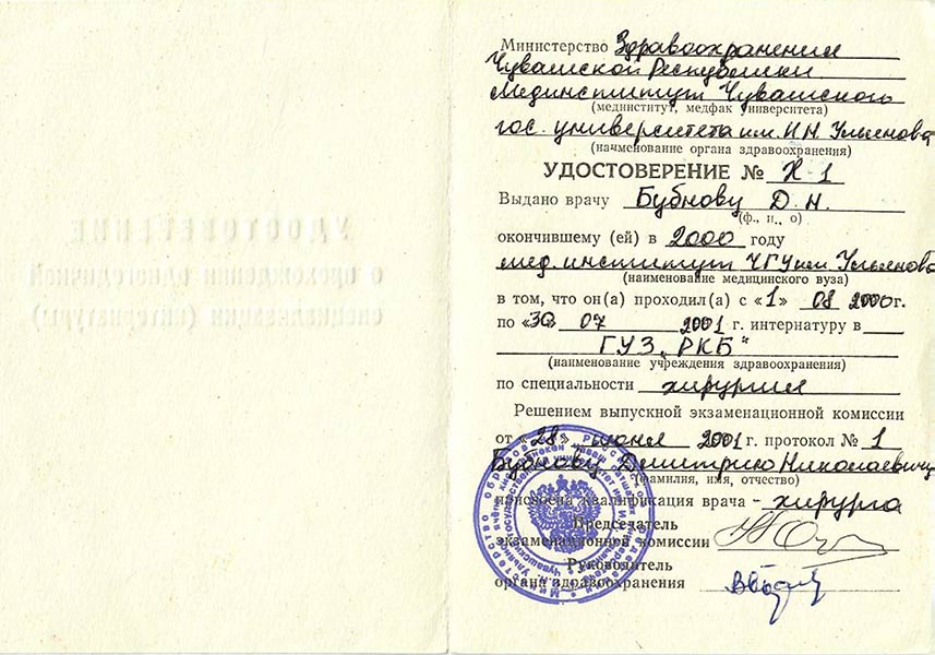 - Интернатура: Чувашский Государственный Университет им. И.Н.Ульянова — специальность «Хирургия» (2001 г.).