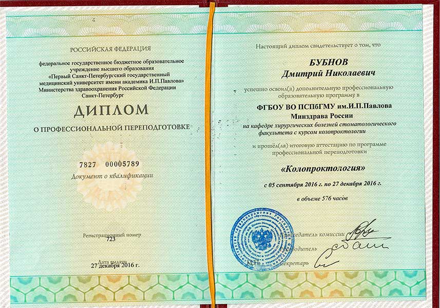 - Профессиональная переподготовка: ФГБОУ ВО «Первый Санкт-Петербургский государственный медицинский университет имени академика И. П. Павлова» Министерства здравоохранения РФ — «Колопроктология» (2016 г.).