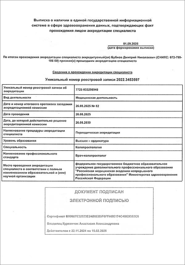 Аккредитация специалиста №7725 033298948 по специальности «Колопроктология», сроком действия до 26.08.2030 г.