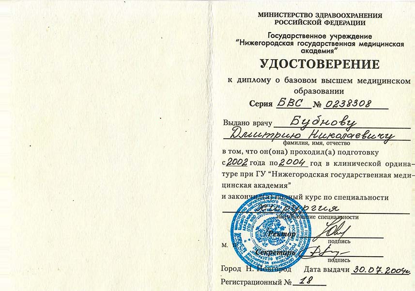 - Ординатура: ГУ «Нижегородская государственная медицинская академия» — специальность «Хирургия» (2004 г.).