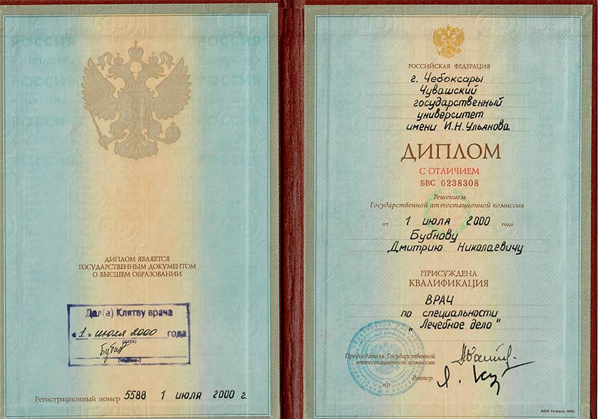 - ВУЗ: Чувашский Государственный Университет им. И.Н.Ульянова — специальность «Лечебное дело» (2000 г.).
